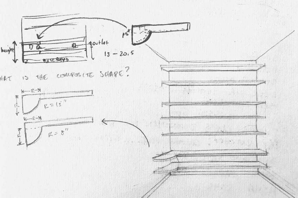 The ask was twin arched bookshelves to go on either side of a bed, like the following reference photo. Howevere these were to sit on top of some existing nightstands.